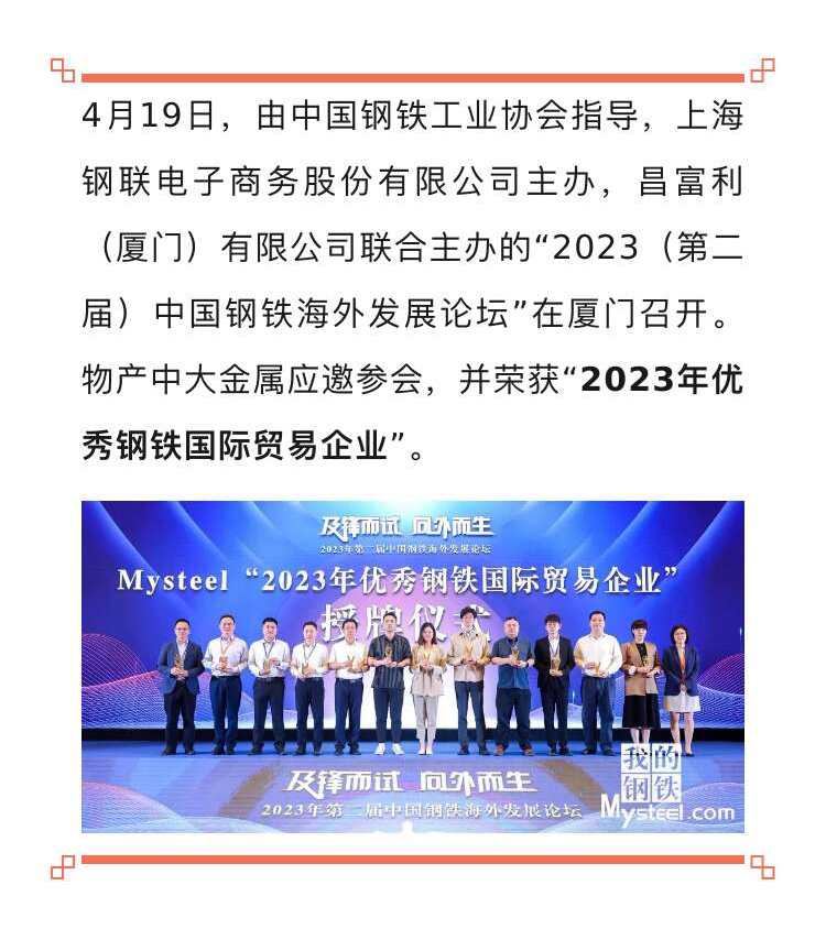 物產中大金屬榮獲“2023年優秀鋼鐵國際貿易企業”